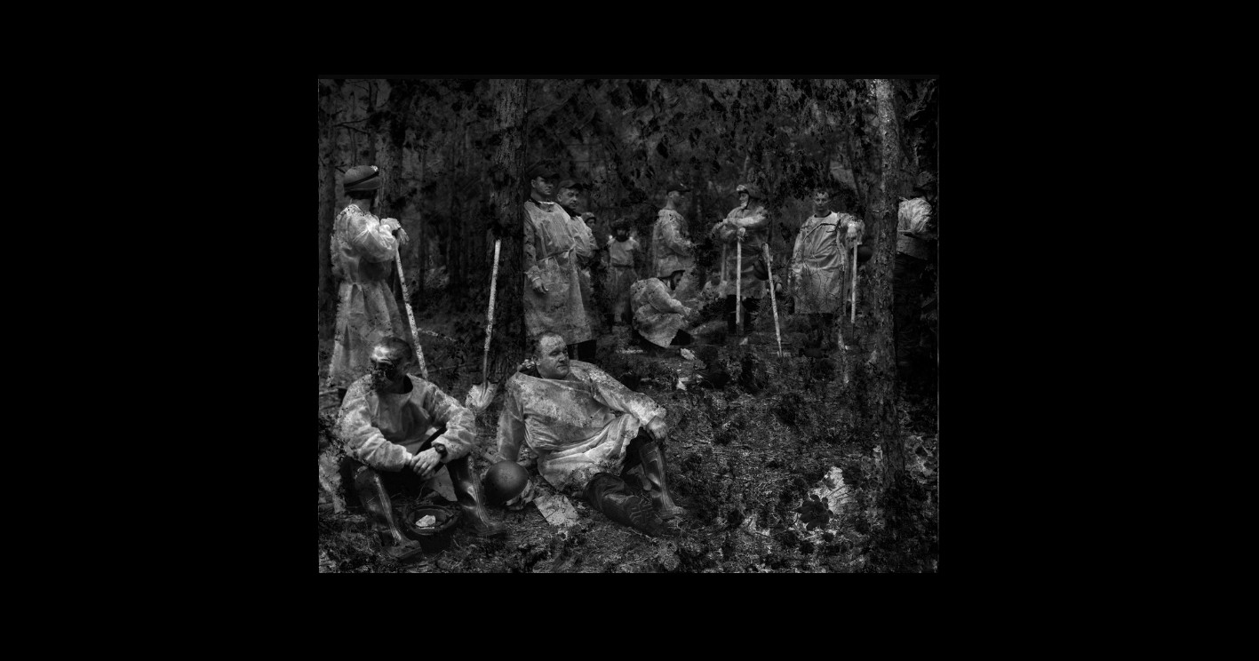 Généralement, septembre arrive avec des matins de brouillard laiteux et les premiers vents froids. En septembre 2022, les visages des fossoyeurs qui travaillaient à l’exhumation des corps dans la forêt de la ville d’Izium sont devenus plus froids que n’importe quel autre matin. La plupart des images qui ont submergé mon fil d’actualité ne montraient pas des corps nus ; la plupart des corps étaient dans des sacs blancs ou bleus en plastique. Les infirmiers militaires sur ces images portaient le même type de vêtements de sécurité, blancs et bleus également. Tant les fantômes que les anges portaient des habits fait de polyéthylène. De manière significative, dans un ensemble photographique nommé Izium Forest de l’artiste ukrainienne Yana Kononova, [détail de cet ensemble en tête de l'article] il n’y a pas de cadavres. Pourtant, la tristesse et l’angoisse deviennent encore plus aigües lorsque l’on regarde les visages des infirmiers—ceux qui ont vu la mort. Kononova décrit ces infirmiers quasiment comme une extension de la forêt qui pousse autour d’eux. Dans son image en noir et blanc, les gens ressemblent à des fantômes dans un bois brumeux. Ils regardent l’appareil photo et autour comme si cet appareil n’existait pas.