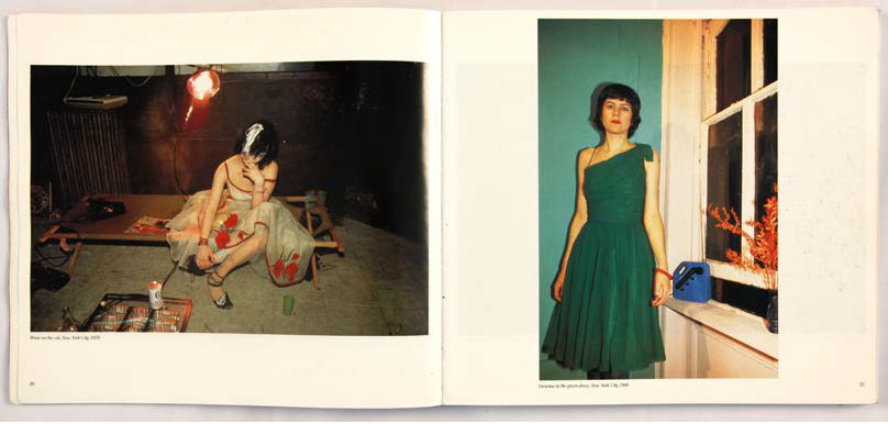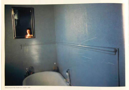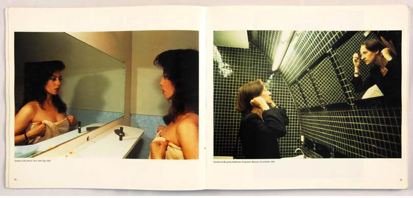 Elle met ainsi à distance son rôle d’artiste et permet à Nan d’exister comme un personnage parmi les autres. De ce fait, Nan Goldin renvoie à trois identités distinctes : la photographe, le personnage de Nan et la Nan réelle, dont la présence est suggérée par le regard (Susan in the dune buggy p.88). Lorsqu’un Selfportrait surgit (pages 22 et 39), ce sont les trois rôles qui fusionnent. L’artiste crée des situations photographiques qui renvoient directement au genre de l’autoportrait : en prenant son reflet dans le miroir (p.22), ou en tenant l’appareil à bout de bras (p.39). C’est l’intention au moment de la prise de vue qui permet de faire la distinction.