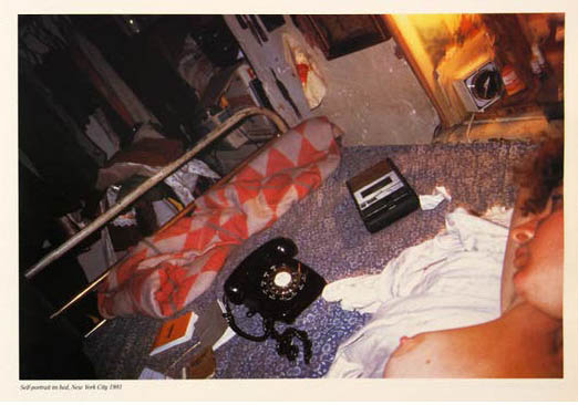 La manière dont Nan Goldin apparaît dans le livre est intéressante. Dans de nombreuses légendes, elle préfère utiliser la troisième personne du singulier pour parler d’elle (pages 11, 83, 125, 130 et 137). Elle utilise à quelques reprises la première personne du singulier, pour des images où nous ne voyons pas son visage. Trois d’entre elles se destinent à identifier son lit, sur lequel se trouvent différents personnages : Lynelle on my bed p.32, Kowald on my bed p.63 et Brian on my bed p.67. Une autre, plus mystérieuse : Me on top of my lover p.132, donne une identité à l’un des corps photographié. Dans le texte de remerciements, on découvre également que trois photographies sur lesquelles elle apparaît sont réalisées par quelqu’un d’autre : Greer Lankton (p.11), Suzanne Fletcher (p.83) et Trish McAdams (p.125). L’utilisation d’images dont elle n’est pas l’auteure désacralise son rôle de photographe.