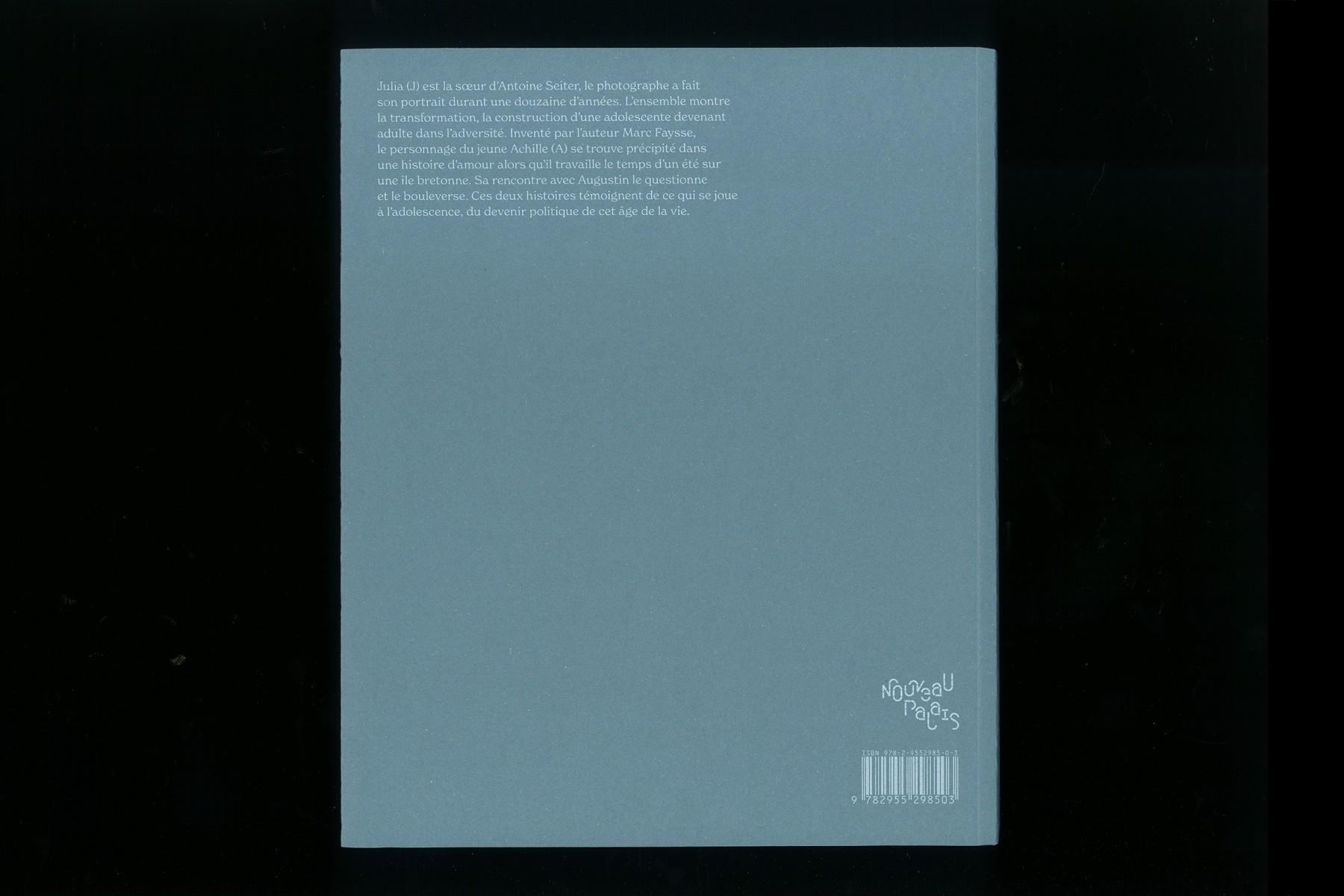 Antoine Seiter est né dans un village du Loir-et-Cher. Pendant ses études, il revient régulièrement chez ses parents et commence à photographier sa sœur cadette, Julia (J). Le projet, débuté en 2008 se poursuit encore aujourd'hui. Ce livre imprime une étape, une douzaine d'années témoignant de l'enfance, l'adolescence et du passage à l'âge adulte de sa sœur. La séquence est marquée par un accident, les changements du corps et le travail. Elle témoigne surtout de la relation entre le photographe et sa sœur. Ce face à face nous dévoile les multiples facettes de son visage, l'ouvert et le fermé. C’est à dire la capacité du visage à se connaître, reconnaître et dialoguer avec l'autre.