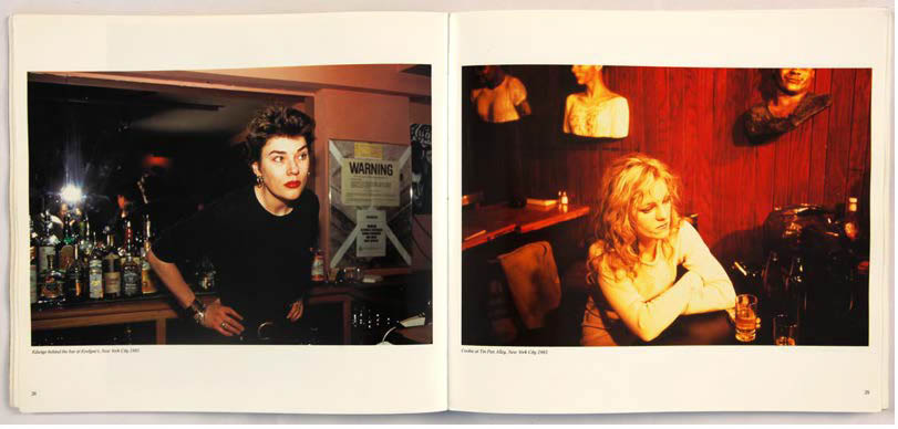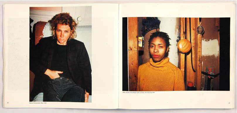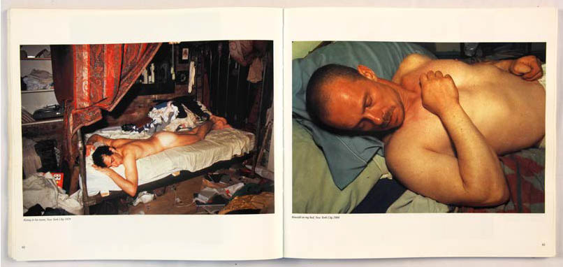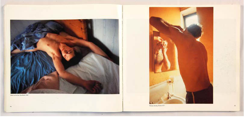 La manière dont Nan Goldin apparaît dans le livre est intéressante. Dans de nombreuses légendes, elle préfère utiliser la troisième personne du singulier pour parler d’elle (pages 11, 83, 125, 130 et 137). Elle utilise à quelques reprises la première personne du singulier, pour des images où nous ne voyons pas son visage. Trois d’entre elles se destinent à identifier son lit, sur lequel se trouvent différents personnages : Lynelle on my bed p.32, Kowald on my bed p.63 et Brian on my bed p.67. Une autre, plus mystérieuse : Me on top of my lover p.132, donne une identité à l’un des corps photographié. Dans le texte de remerciements, on découvre également que trois photographies sur lesquelles elle apparaît sont réalisées par quelqu’un d’autre : Greer Lankton (p.11), Suzanne Fletcher (p.83) et Trish McAdams (p.125). L’utilisation d’images dont elle n’est pas l’auteure désacralise son rôle de photographe.