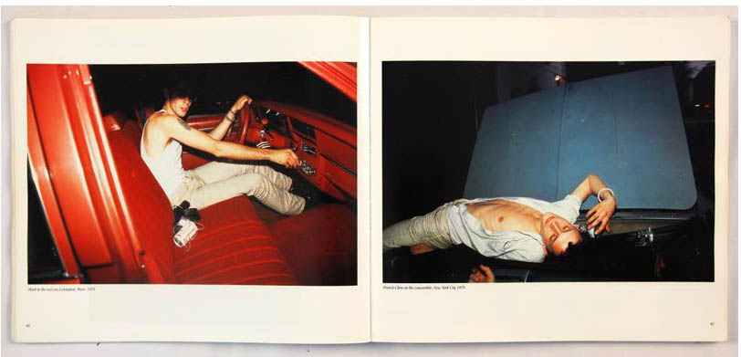 Elle met ainsi à distance son rôle d’artiste et permet à Nan d’exister comme un personnage parmi les autres. De ce fait, Nan Goldin renvoie à trois identités distinctes : la photographe, le personnage de Nan et la Nan réelle, dont la présence est suggérée par le regard (Susan in the dune buggy p.88). Lorsqu’un Selfportrait surgit (pages 22 et 39), ce sont les trois rôles qui fusionnent. L’artiste crée des situations photographiques qui renvoient directement au genre de l’autoportrait : en prenant son reflet dans le miroir (p.22), ou en tenant l’appareil à bout de bras (p.39). C’est l’intention au moment de la prise de vue qui permet de faire la distinction.
