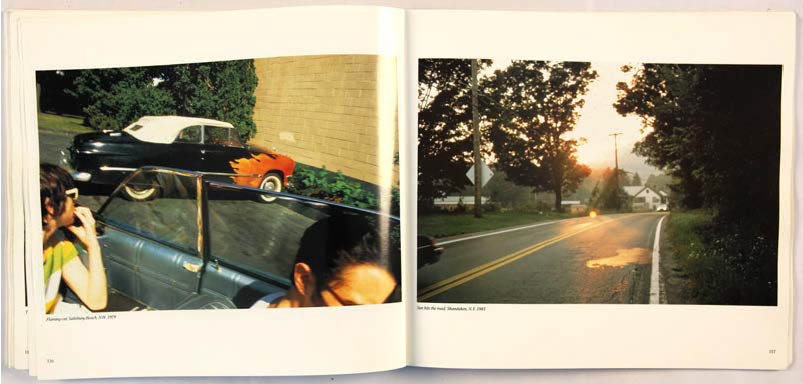 Les chapitres After Hours (p.114 et 115) et All Tomorrow’s Party (p.116 et 117) se succèdent aussi avec un basculement de lumière, soutenu par les paroles de chanson. After Hours (après des heures) c’est toujours la fête. La photographie Dieter and Wolfgang at the O-bar (p.115) est prise sans flash, la lumière orange et l’attitude des personnages évoquent la fin de soirée. Les mots : « If you close the door, The night could last forever. Leave the sunshine out, And say hello to never. All the people are dancing, And they’re having such fun, I wish it could happen to me. But if you close the door, I’d never have to see the day again » assurent la transition de la fête au lendemain, de la nuit à la lumière du jour des pages 116 et 117 (Sun hits the road p.117).
